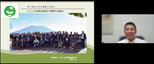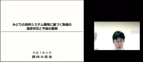 農林水産省では「みどりの食料システム戦略」において、農業の生産力向上と持続性の両立をイノベーションで実現させることにより、農林水産業のCO2ゼロエミッション化の実現や、化学農薬や化学肥料の使用量の低減、有機農業の取組面積の拡大等を掲げているところです。この戦略の実現に向けて、イノベーションが創出され、社会実装される当面の間においては、既に現場で実践されている持続的な農業生産や有機農業に係る様々な生産技術を横展開することにより、これらの農業に取り組む農業者を増やしていくことが重要とされております。このようなことから、「みどりの食料システム戦略」の実現に向けた様々な課題解決の一助とするため「みどりの食料システム推進セミナー」をオンライン(Zoom利用)で開催しました。
