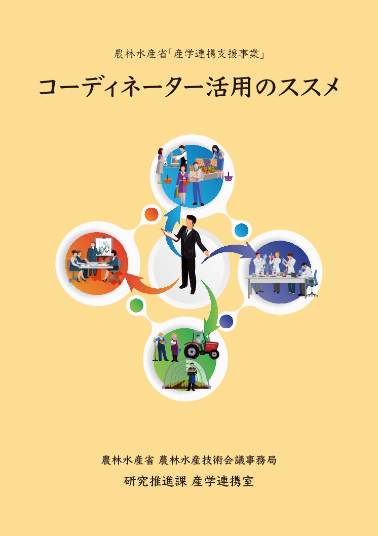 農林水産省では、我が国の農林水産・食品産業の成長産業化を通じて、国民が真に豊かさを実感できる社会を構築するため、農林水産・食品分野と様々な分野との連携により、革新的な研究成果を生み出し、これらをスピード感を持って商品化・事業化に導く、新たな産学連携研究の仕組み(「知」の集積と活用の場)による研究開発に取り組んでいます。「知」の集積と活用の場を始めとした産学連携による研究開発を推進するため、コーディネーターを全国に配置し、民間企業等が行う商品化・事業化に向けた研究開発や、農林水産・食品分野と様々な分野が連携した研究開発の促進を図ることを目的として、「『知』の集積による産学連携支援委託事業」を実施しています。